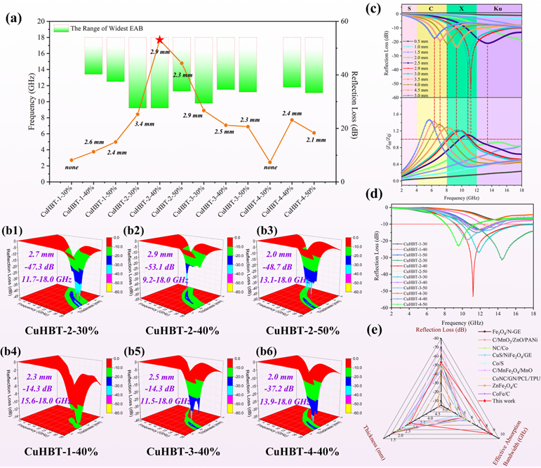 优化后的CuHBT-2纳米片展现出卓越的磁吸收性能,在厚度仅为2.9毫米时,其最小反射损耗RLmin达到−53.06 dB的历史新低,同时在X波段和Ku波段实现了8.80 GHz的超宽有效吸收带宽。这一双重突破得益于其分层迷宫结构的设计——该结构通过最大化电磁波迷宫效应和界面极化耗散,显著提升了材料的电磁特性。