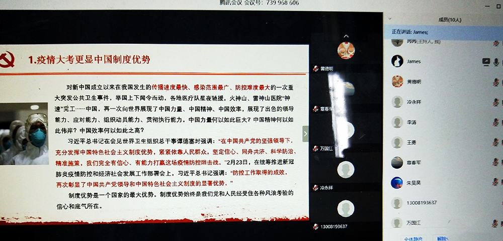 接着,贺剑同志带领与会成员集中学习了《疫情大考更显中国制度优势》和《战“疫”彰显中国特色社会主义制度优势》两篇文章。贺剑同志讲到面对新中国成立以来在我国发生的传播速度最快、感染范围最广、防控难度最大的一次重大突发公共卫生事件,举国上下闻令而动,各地医疗队星夜驰援,火神山、雷神山医院“神速”完工……再一次向世界展现了中国力量、中国精神、中国效率。各项举措的层层落实也是中央权威的再次彰显,彰显了中国共产党领导和中国特色社会主义制度的显著优势。我们要增强“四个意识”、坚定“四个自信”、做到“两个维护,坚信防疫工作的胜利终将到来。但也要清醒地认识到,疫情防控仍然是当前工作的重中之重。稍一松懈就会前功尽弃,务必要保持必要的警惕性,毫不放松,抓紧、抓实、抓细学院各项防控工作。