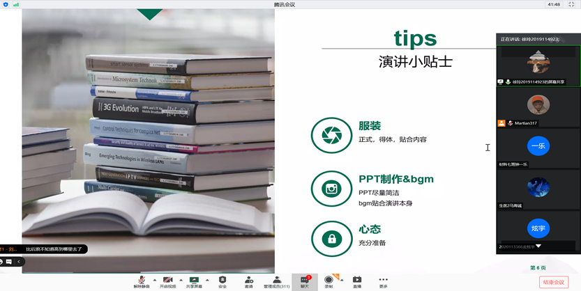 为帮助2020级本科新生提高语言表达能力和演讲水平,全面提高综合素质,从而更加充分地准备参加所在班级团支部的“‘四史’故事我来讲”主题团日活动,材料学院本科生第二(2020级)党支部联合taptap188官网入口演讲与口才协会于9月20日15:00-16:00通过腾讯会议平台开展了演讲与口才基本技巧的培训活动。活动由年级助理李子浩同学主持。
