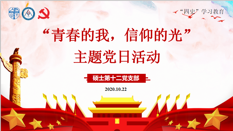 2020年10月22日晚20:00,材料学院研究生第十二党支部在材料学院研讨室3344开展了“青春的我,信仰的光”主题党日活动暨“四史”学习会。活动由支部书记尹佳宁同志主持,支部全体党员及部分积极分子共计21人参加。
