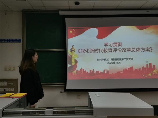 2020年11月2日晚上7:30,材料学院研究生第二党支部在逸夫馆4421召开第九次组织生活会,会议由周丹彤同志主持。本次会议同志们进行了关于《深化新时代教育评价改革总体方案》的学习。