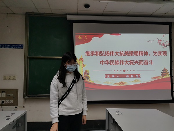谌金梅同学还向我们介绍了习近平总书记在纪念中国人民志愿军抗美援朝作战70周年大会所做的讲话,告诉我们抗美援朝战争伟大胜利再次证明,没有任何一支政治力量能像中国共产党这样,为了民族复兴、人民幸福,不惜流血牺牲,不懈努力奋斗,团结凝聚亿万群众不断走向胜利。