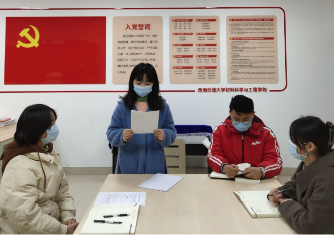 2020年12月11日19:30,材料学院本科生第四(2018级)党支部在X2127b召开了全体党员大会,旨在讨论预备党员邱未灵同志的转正问题。本次会议由支部书记梁喻嘉同志主持。
