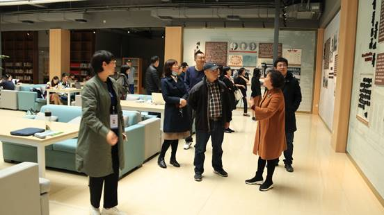 在九里读者服务部杨江丽主任和图书馆办公室黄萍建副主任的引导和讲解中,参观茅以升图书馆并详细了解图书馆的读者服务工作。
