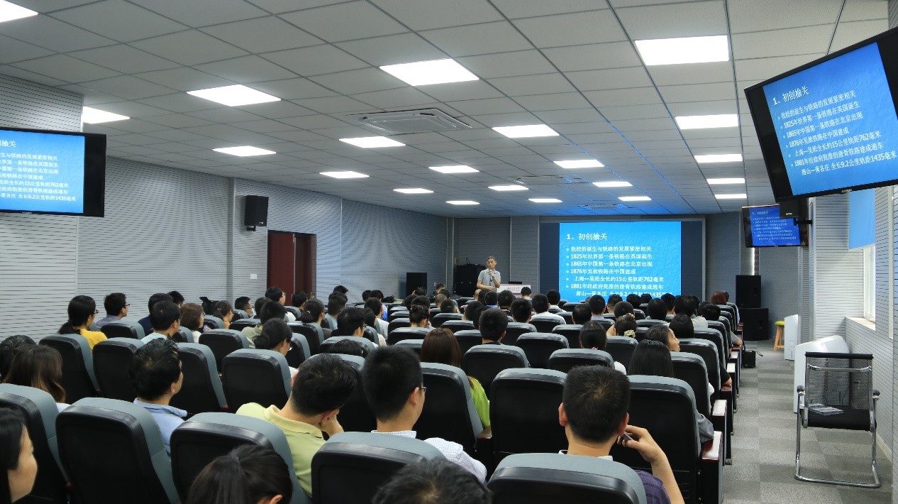 梁锦唐老师以“世纪回眸”为题,通过“初创榆关”、“复校唐山”、“搬迁峨眉”、“定址蓉城”和“扩建犀浦”五个关键时间点,解说交大125年的辉煌校史;通过杰出员工、中国共产党早期党员武怀让、冯亮功的事迹以及抗美援朝中的交大人,讲述公司党组织的建立和发展;通过学院1931年创立的决定,杰出员工、“两弹一星”功勋奖章获得者姚桐斌的介绍,呈现学院的发展历史。