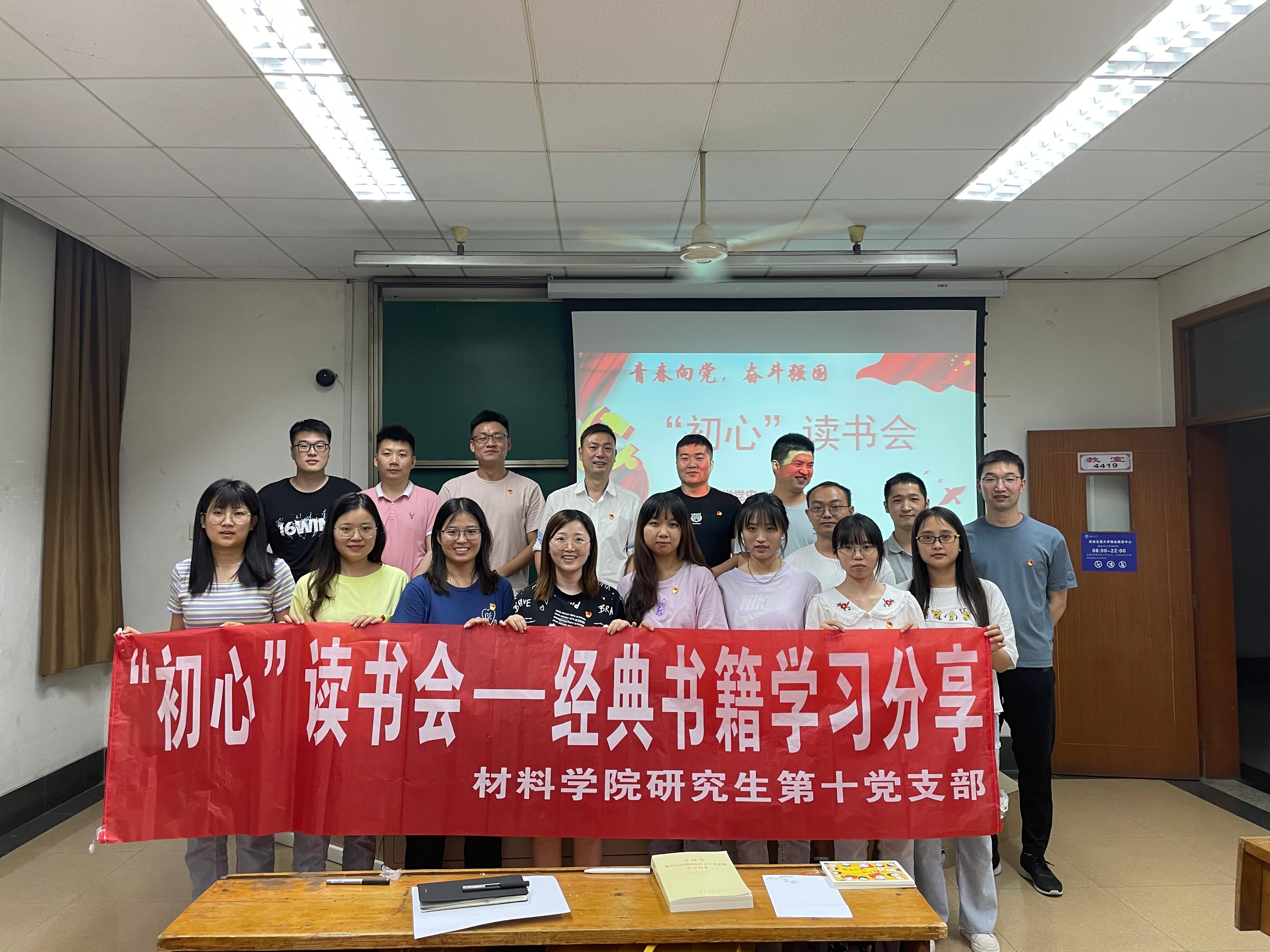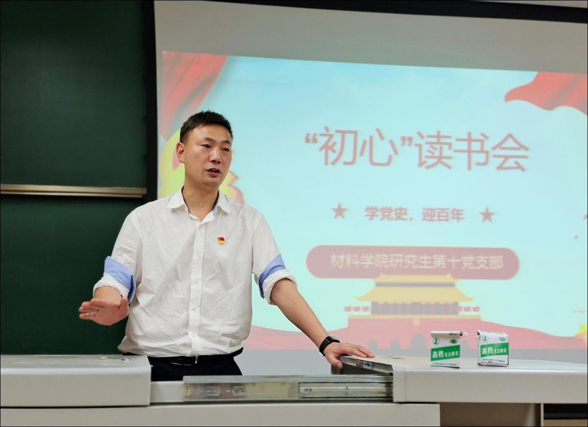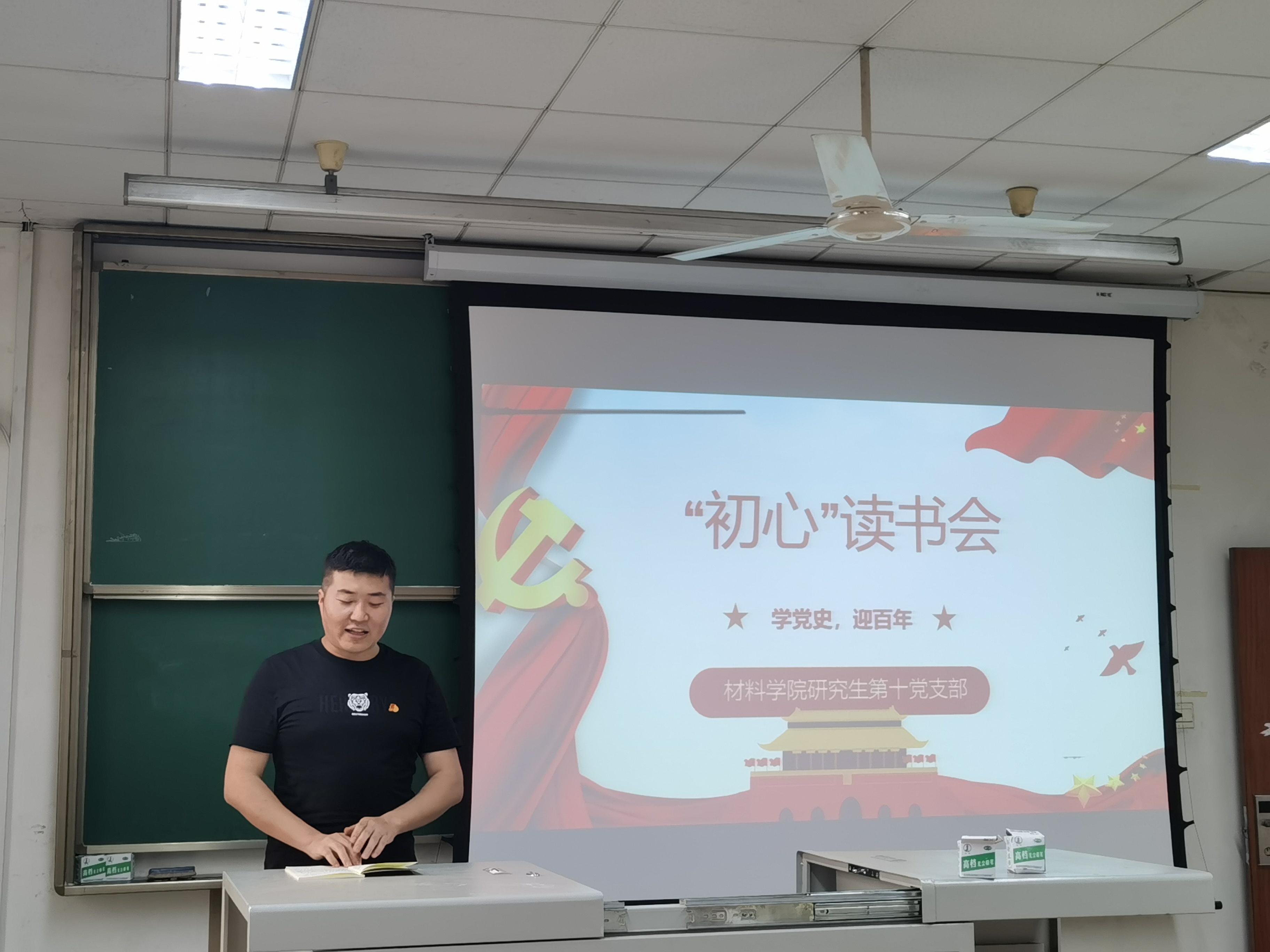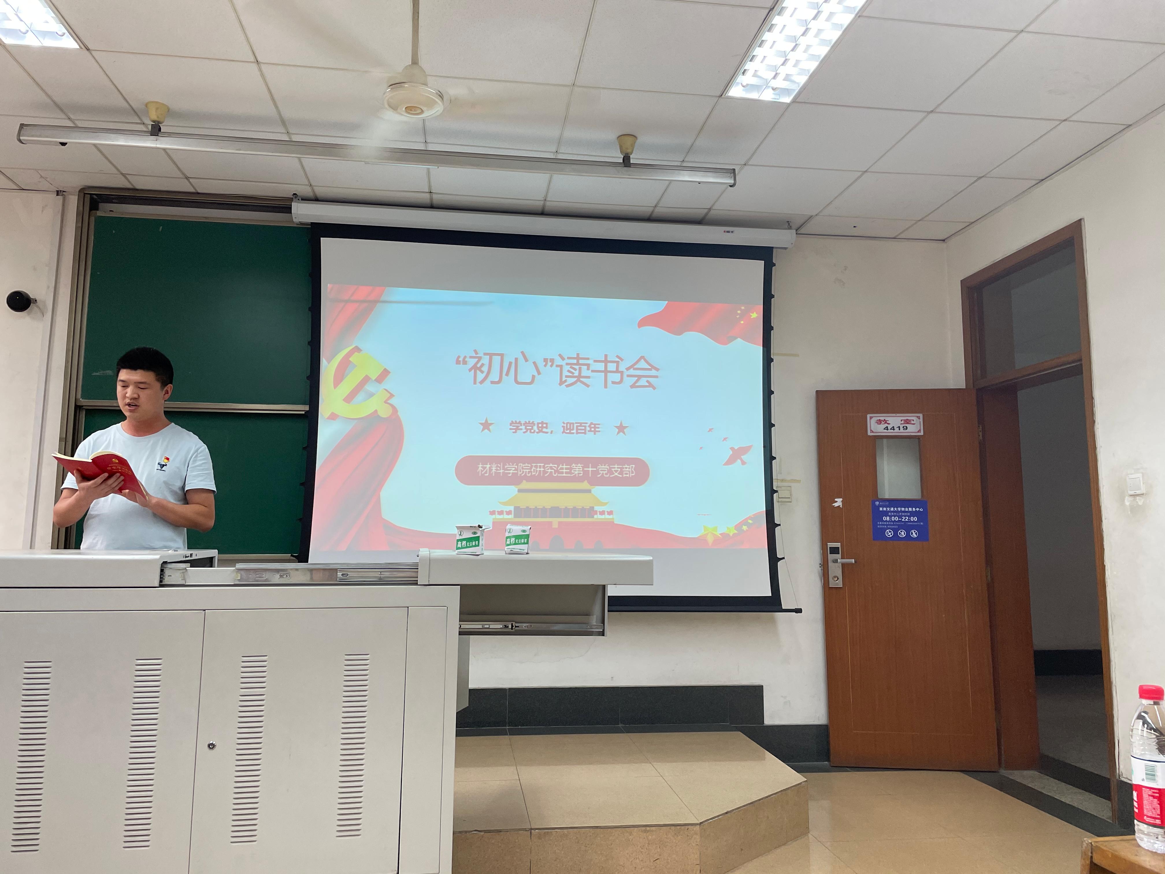 为深入学习贯彻习近平新时代中国特色社会主义思想,热烈庆祝中国共产党建党100周年,按照新时代党建工作要求,根据学校、公司党史学习教育工作部署,为进一步引导青年员工党员“学党史、强信念、跟党走”,6月10日晚19:00,材料学院第十党支部召开“初心”读书会,进行经典书籍学习分享。本次读书会由党支部书记王誉静主持,材料公司党委副书记、纪委书记章春军同志参与本次活动,第十党支部全体党员及部分入党积极分子参与本次分享会。