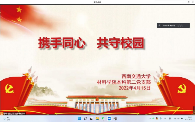 2022年4月15日晚8点,材料学院本科生第二党支部线上开展了“携手同心 共守校园”主题党日活动。党支部书记郑纪伟领学“第一议题”——《习近平总书记在北京冬奥会、冬残奥会总结表彰大会上的讲话》。党支部委员曾如雨主持会议,并领学“始终坚持人民至上、生命至上”——习近平总书记指挥打好统筹疫情防控和经济社会发展之战述评。支部成员和入党积极分子共50余人参加。
