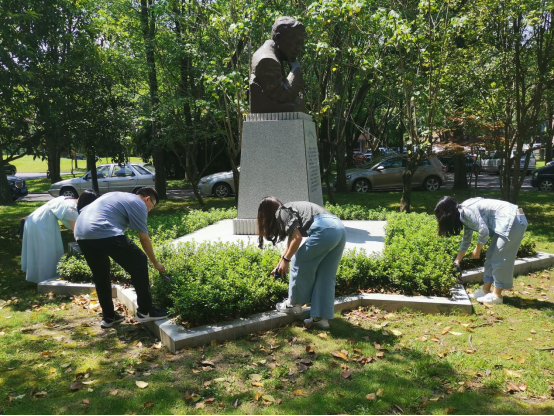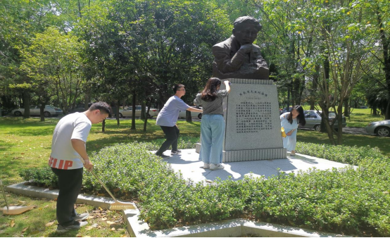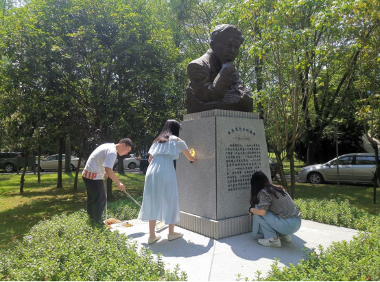 活动第二部分,九里校区陈能宽院士雕像清洁和思源厅清扫。同学们为陈能宽院士雕像进行擦拭、清除周围花坛的杂草和垃圾等。大家在打扫的同时,多次阅读陈能宽院士的生平简介,脑海中也浮现起在党支部主题活动中学习的陈能宽精神,陈能宽院士的精神令人敬佩。