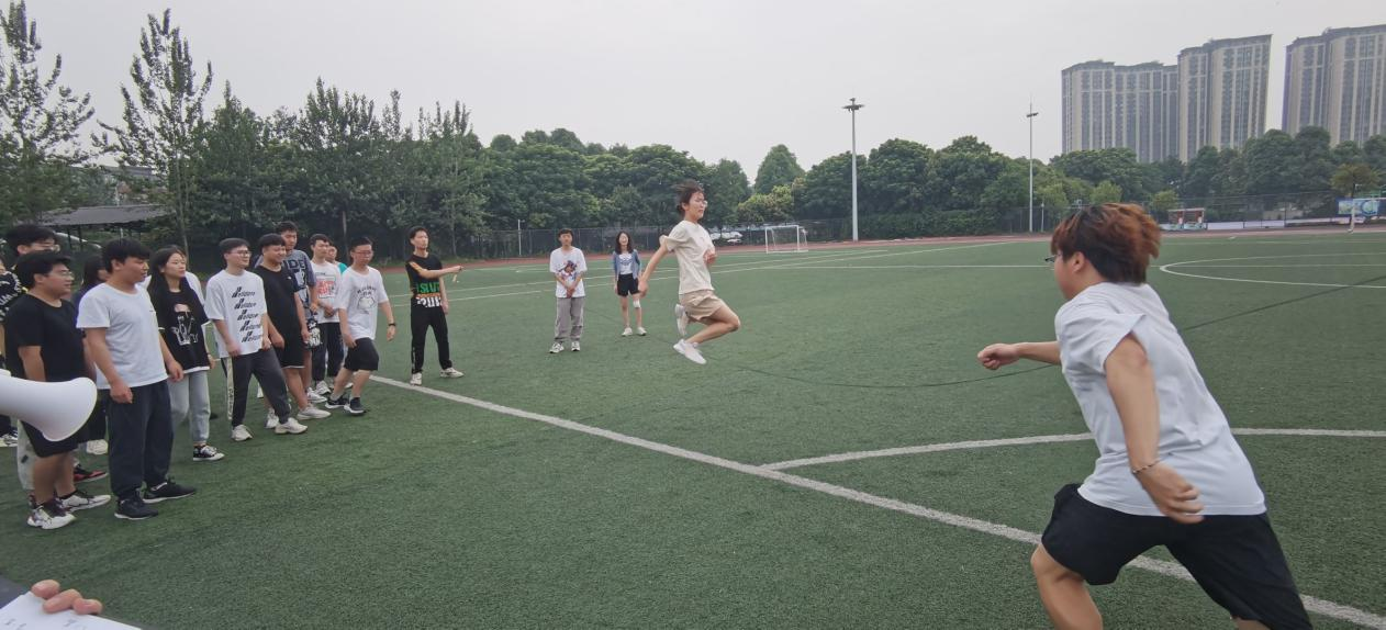随后在任思雨、周孟雪、程莹洁的组织下进行了第一个项目——绑腿跑,每组队员将绑带绑好进行短暂练习后进行比赛,锻炼了协作能力和身体协调性。