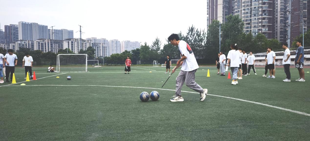 第二个项目是“赶猪”小游戏,每个队员用一根棍子赶着两个足球跑进行接力,各组成员在短暂练习之后针对规则加以思考,总结经验教训,随后进行比试。