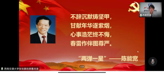 张佳豪同志代表材料学院向全校和社会展示了材料学院杰出员工陈能宽的“许身卫国最难忘”的爱国情愫和淡泊名利的作风。彰显了材料学院对“科学家精神”育人的高度重视。