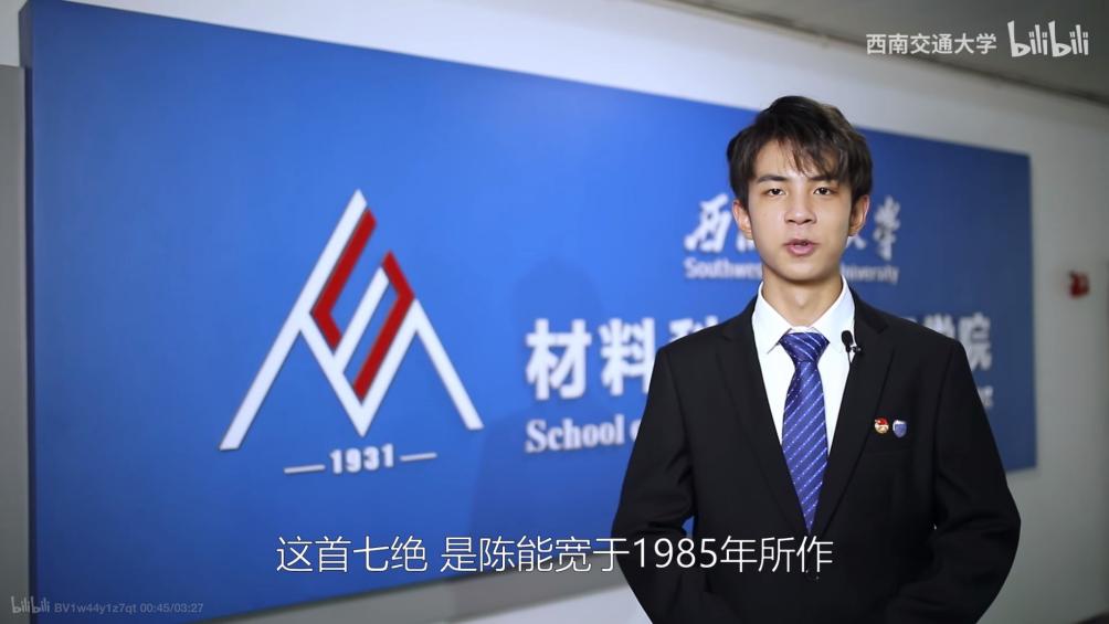 视频中张佳豪同志用简练的语言概述了材料学院“两弹一星”元勋陈能宽先生的生平事迹,讲述了陈能宽从国内求学,远赴西方留学到毅然回国参加“两弹一星”研发的经历,刻画了陈能宽“许身为国最难忘”的朴素爱国情怀,号召当代青年人继承先辈志向,立志建设祖国,不忘先辈对我们“要为中华人民共和国写篇大论文”的殷切期盼,传承、践行竢实扬华精神。