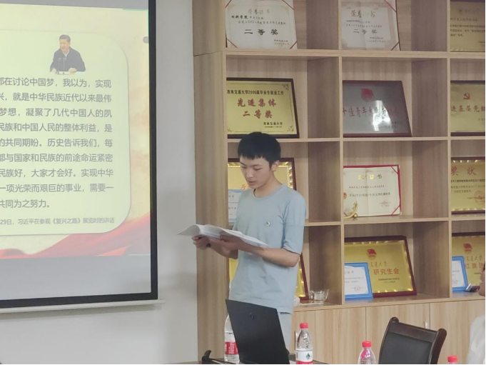 来自高分子2020-01班的胡烨同志主讲《实现中华民族伟大复兴是近代以来中华民族最伟大的梦想》。胡烨围绕中国梦的历史、本质、实现路径,以及中国共产党的初心和使命、中国梦和世界梦的关系等五个方面进行详细的阐述,帮助与会同志对实现中华民族伟大复兴的中国梦建立起系统性和全局性的认识,更深刻理解了新时代青年所肩负的责任使命。