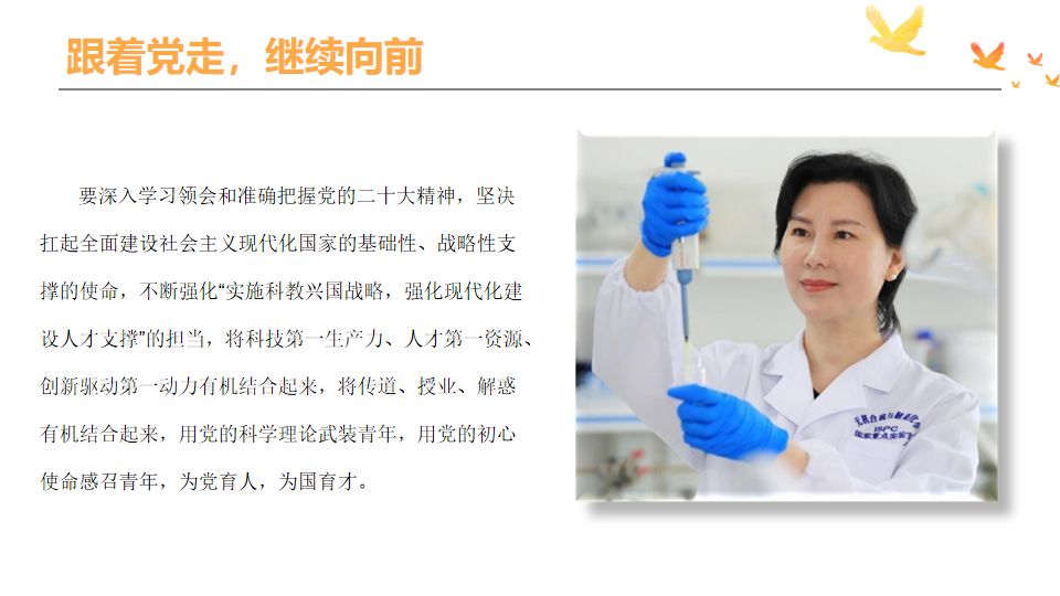 来自学院本研各员工党支部的员工代表分享党的二十大代表中的科学家风采。李振威同学分享了被誉为“世界菌草技术之父”的林占熺院士的故事,他号召同学们学习林院士求真力行的品质,踏踏实实做好每一件事情。孙熙桐同学分享了致力于乡村振兴、科技扶贫的“农民院士”朱有勇的故事,他表示作为新时代青年,要在科创中增强问题意识,看到质朴问题中的大学问,始终不忘作为新时代青年的责任和担当,像朱有勇院士一样,把论文写在祖国大地上,把科研做到人民的心中。杨峰同学介绍了“航天事业的攀登者”李得天院士的故事,他认为,作为一名研究生党员,要学习李院士在“孔雀东南飞”的潮流中坚持自我实现的本心,打造“飞天”本领的耐心,面临困难能够迎难而上的恒心。康娜同学作为新生入党积极分子代表分享了中国科学院分子细胞科学卓越创新中心研究员陈玲玲的故事,表示要坚定不移听党话,跟党走,敢想敢做又善作善成,在学习中不断践行科学家精神。胡烨同学分享了致力于分子筛纳米孔材料研究的于吉红院士的故事,表示要学习她不慕名利、潜心研究的奉献精神,将个人追求融入建设社会主义现代化国家的伟大事业中,把个人的成长成才融入祖国的伟大发展中。崔晨同学分享了歼-20战斗机总设计师杨伟院士的故事,鼓励同学们志存高远,坚定理想信念,学习杨伟院士的锐意创新的精神以及实事求是、艰苦奋斗的做事态度。