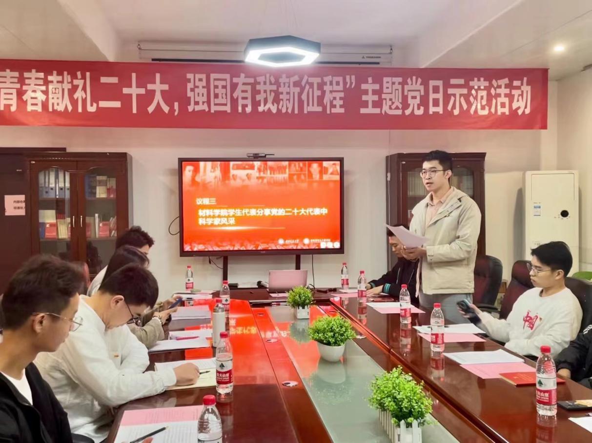 为深入学习贯彻党的二十大精神,大力弘扬和传承 “爱国、创新、求实、奉献、协同、育人”的新时代科学家精神,引导青年学子牢记时代使命,矢志爱国奋斗,材料学院于2022年11月17日下午在犀浦校区员工园区红色驿站组织开展“学习传承科学家精神,汲取新时代奋进伟力”主题党日示范活动。学院团委书记王誉静、研究生党建工作负责人徐励漪、本科生党建工作负责人邓文婷、本科生第二党支部书记郑纪伟以及本研员工党员代表、入党积极分子代表等参加。本次活动由邓文婷主持。