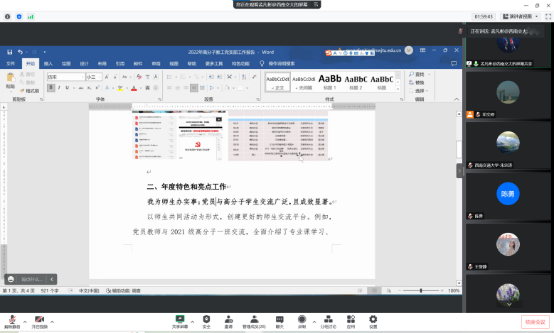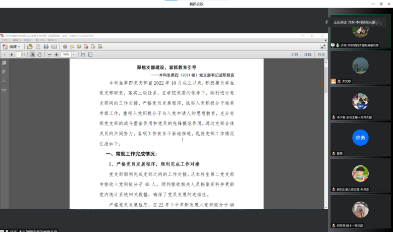 各支部围绕年度常规工作完成情况、年度特色和亮点工作、不足之处及改进措施三个方面对一年的工作进行总结汇报,陈勇对述职支部一对一点评。