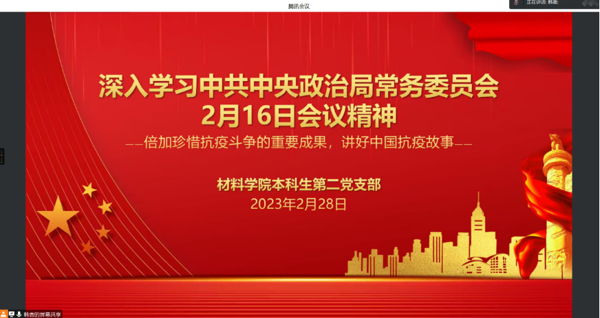 2023年2月28日晚,材料学院本科生第二党支部通过线上组织开展了“中共中央政治局常务委员会2月16日会议精神”专题学习。会上,全体同志共同观看了此次会议精神的专题报道。
