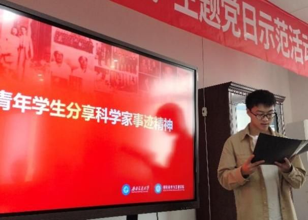 来自学院本科生第一、三党支部的员工代表分享党的二十大代表中的科学家风采。孙熙桐同学分享了致力于乡村振兴、科技扶贫的“农民院士”朱有勇的故事,他表示作为新时代青年,要在科创中增强问题意识,看到质朴问题中的大学问,始终不忘作为新时代青年的责任和担当,像朱有勇院士一样,把论文写在祖国大地上,把科研做到人民的心中。谭子玲同学分享了长期从事生物防御新型疫苗和生物新药研究并具有卓越贡献的陈薇院士,她表示陈薇院士的工作和成就激励我们要勇敢追求自己的梦想,勇敢迈向未知。她展示了热情与勇气能够改变世界,不论梦想有多大,只要有决心,也可以成为改变世界的力量。陈文博同学分享了在激光化学基础研究上,作出了系统性、创造性的贡献的沙国河院士,他呼吁大家学习沙国河院士,以兴趣为引,以责任为纲,始终不忘作为新时代青年的责任和担当,将自己学习的知识和锻炼出来的技能,回馈社会、服务人民。马俊涛同学分享了一生淡泊名利,甘于奉献,从不计较个人得失的宋宝瑞先生,他认为,我们应学习宋宝瑞先生的爱国情怀与责任感,用自己的专业知识解决人民的问题,满足人民的期盼,像宋宝瑞先生一样,以共产党员的政治站位为人民谋福利,为人民谋幸福,将人民群众的心和党紧密相连。